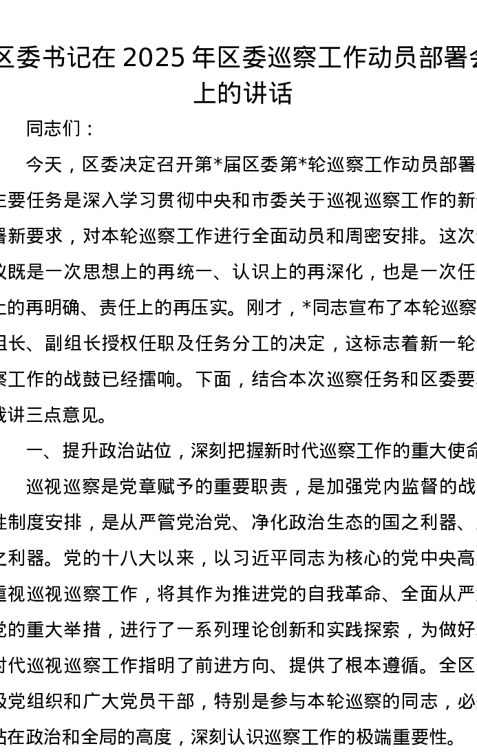 区委书记在2025年区委巡察工作动员部署会上的讲话