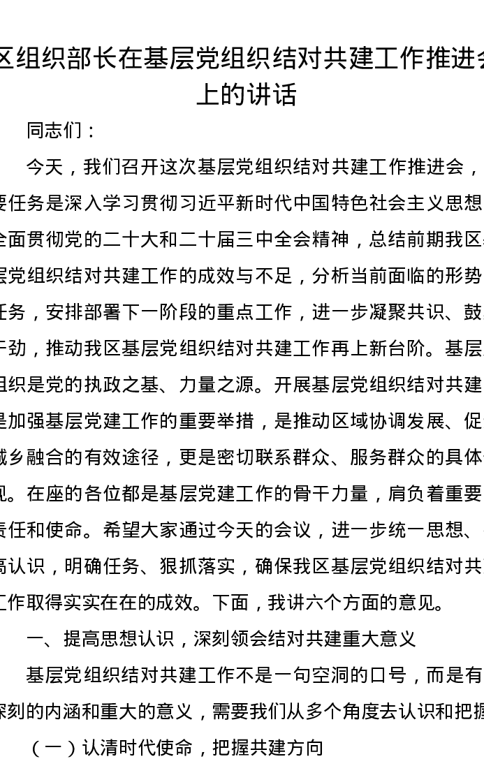 区组织部长在基层党组织结对共建工作推进会上的讲话
