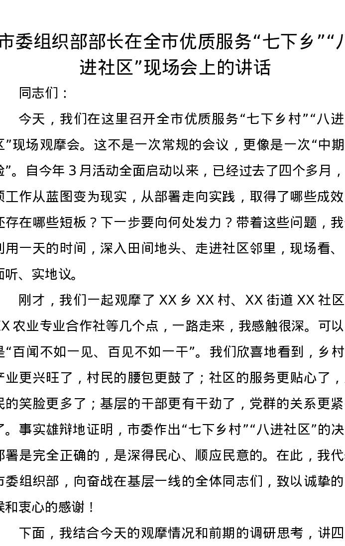 市委组织部部长在全市优质服务“七下乡”“八进社区”现场会上的讲话