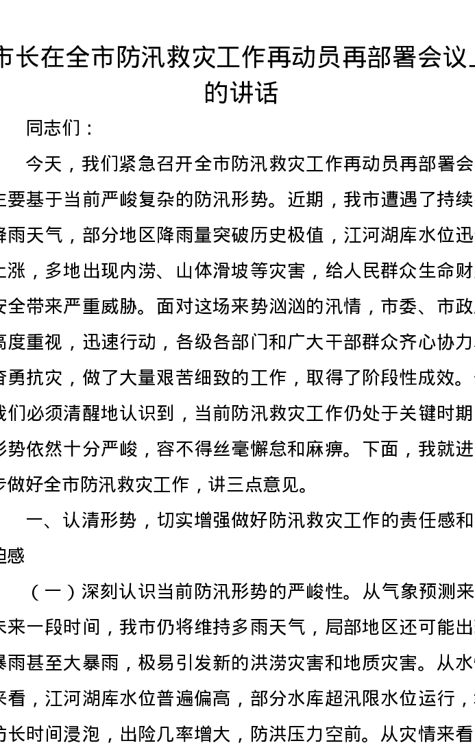 市长在全市防汛救灾工作再动员再部署会议上的讲话