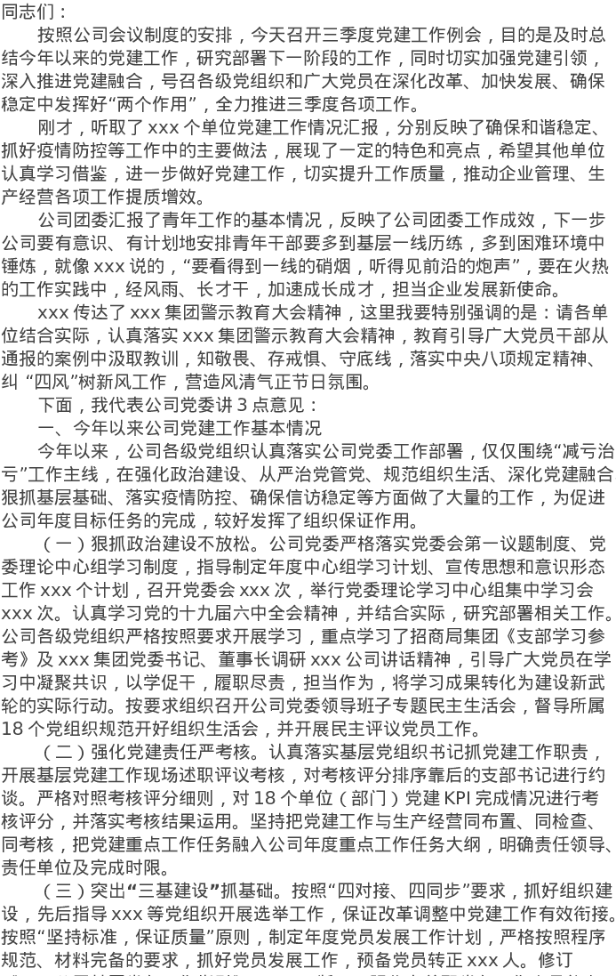 20220705国企党委书记在三季度党建工作例会上的讲话
