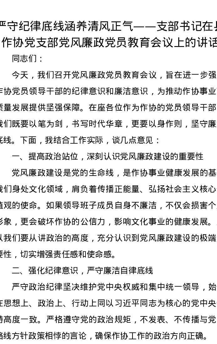 严守纪律底线涵养清风正气——支部书记在县作协党支部党风廉政党员教育会议上的讲话
