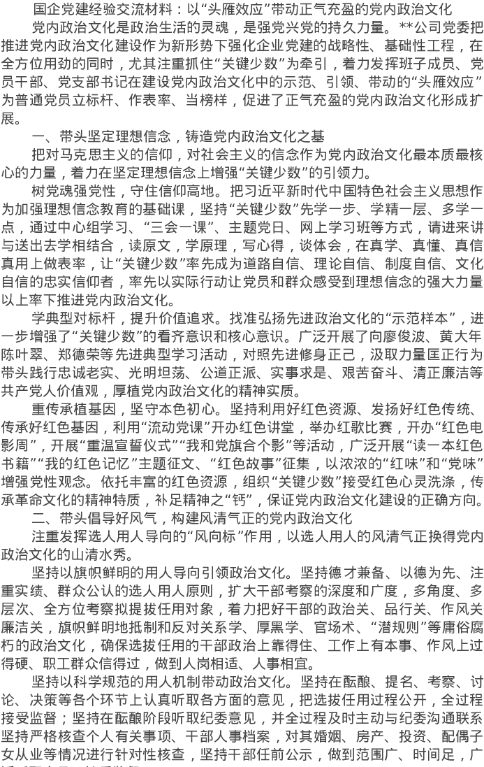 20220709国企党建经验交流材料:以“头雁效应”带动正气充盈的党内政治文化