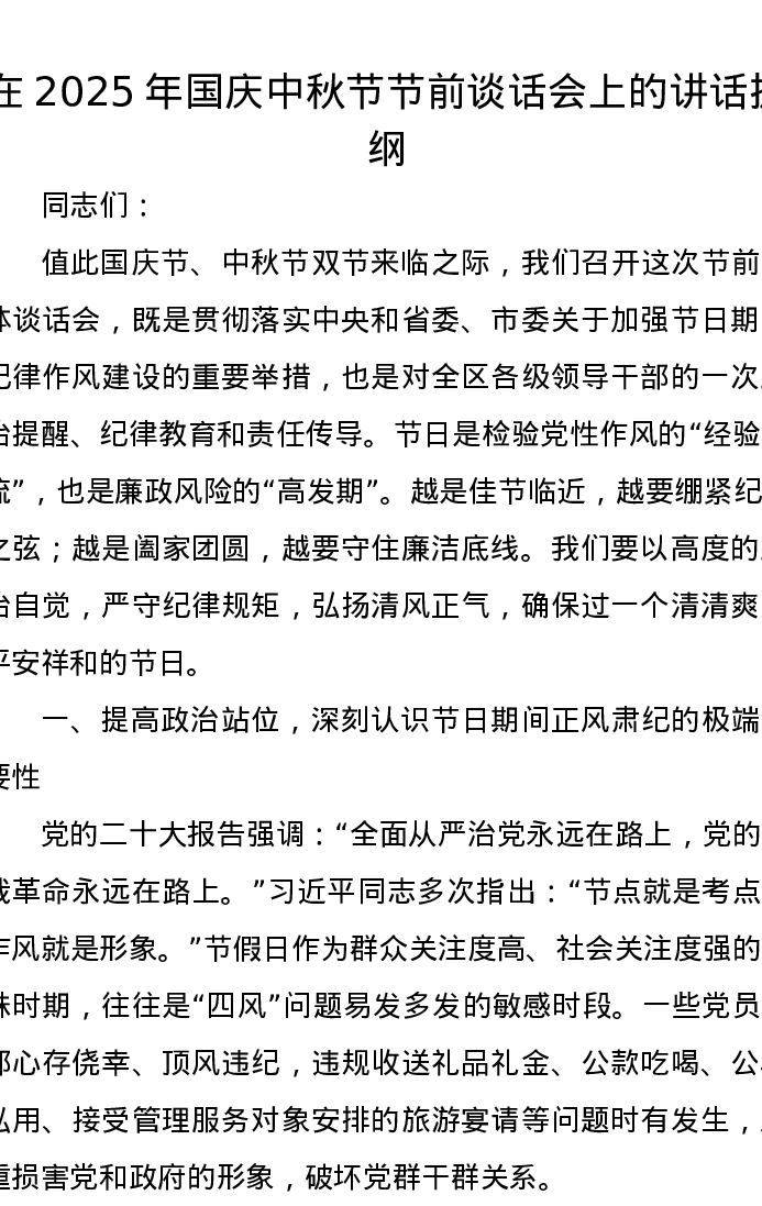 在2025年国庆中秋节节前谈话会上的讲话提纲