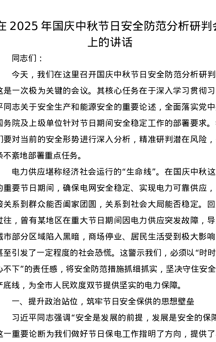 在2025年国庆中秋节日安全防范分析研判会上的讲话