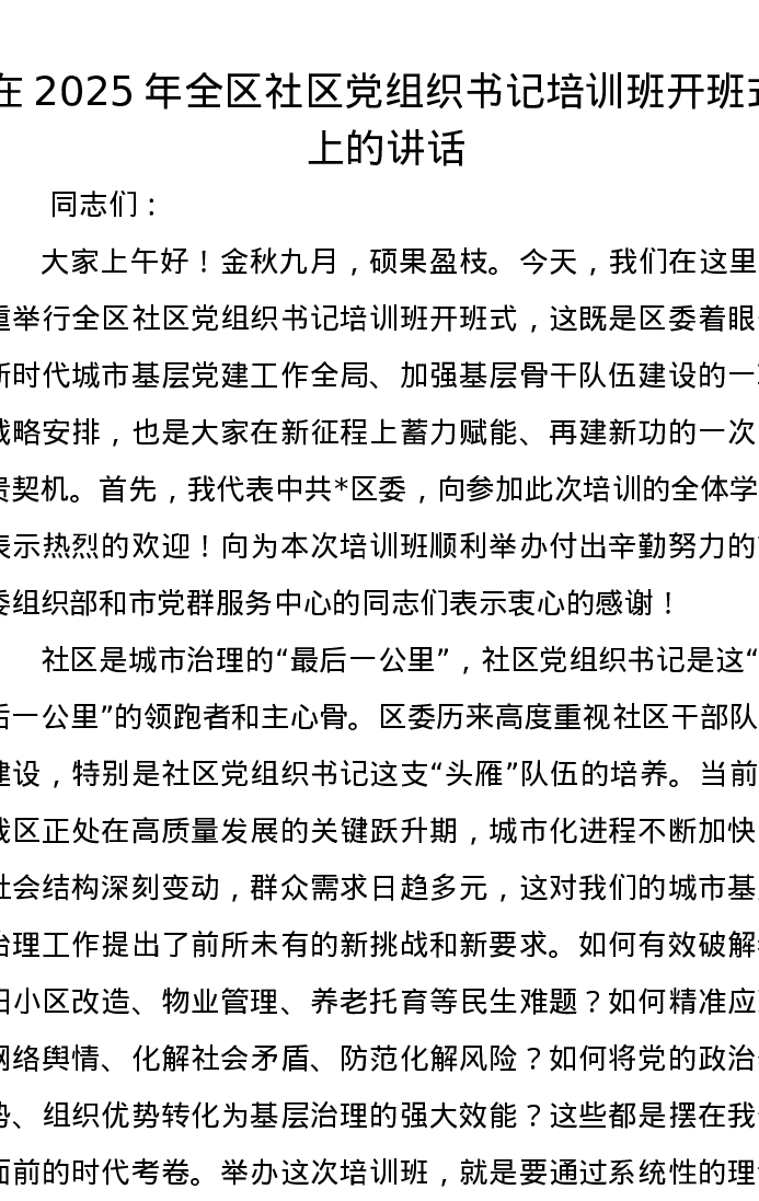 在2025年全区社区党组织书记培训班开班式上的讲话