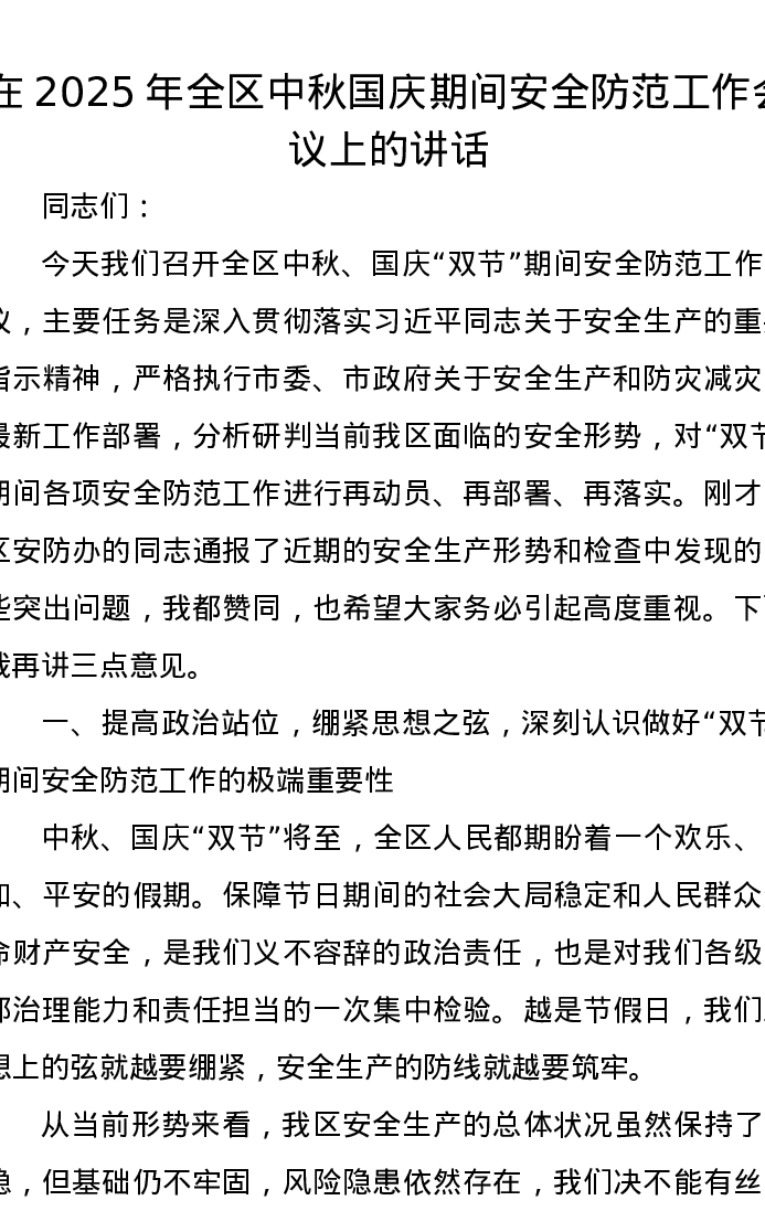 在2025年全区中秋国庆期间安全防范工作会议上的讲话