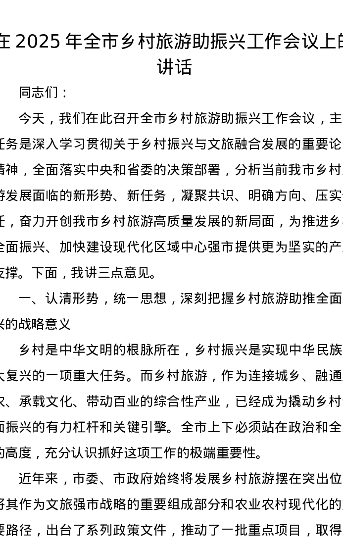 在2025年全市乡村旅游助振兴工作会议上的讲话