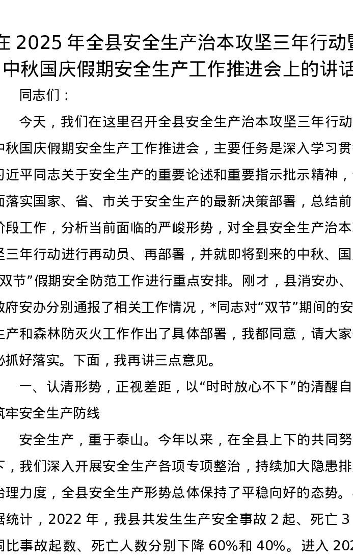 在2025年全县安全生产治本攻坚三年行动暨中秋国庆假期安全生产工作推进会上的讲话