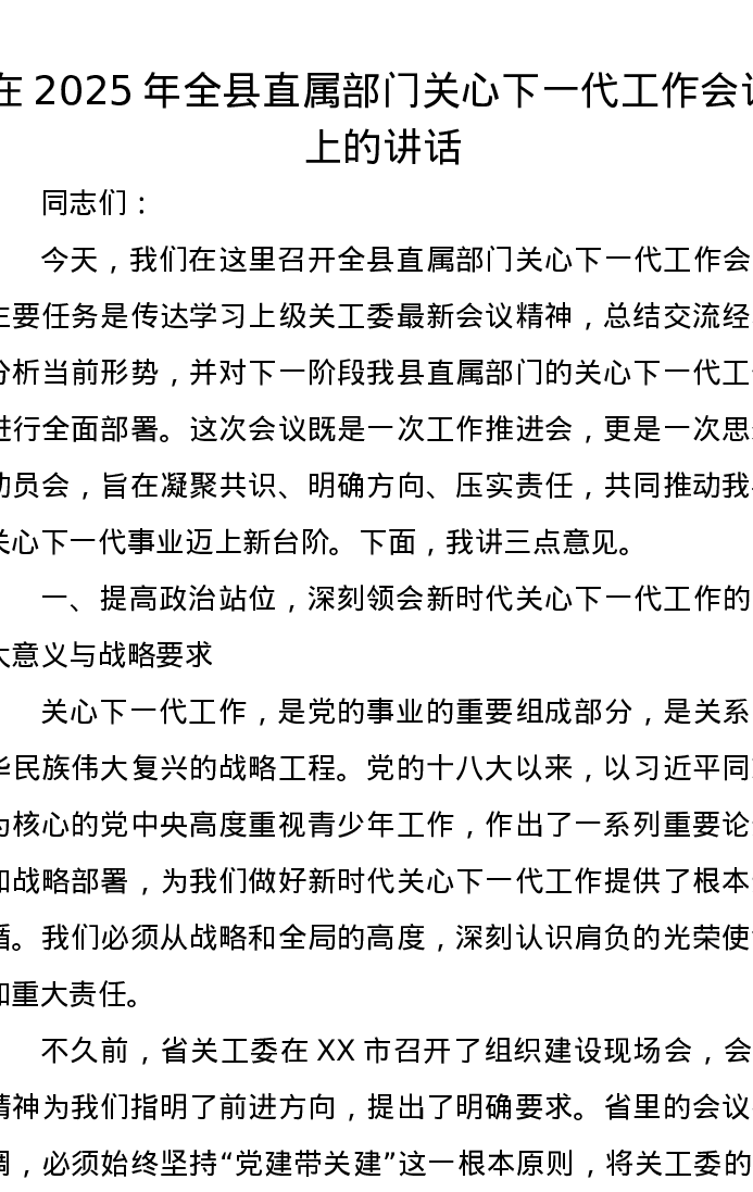 在2025年全县直属部门关心下一代工作会议上的讲话