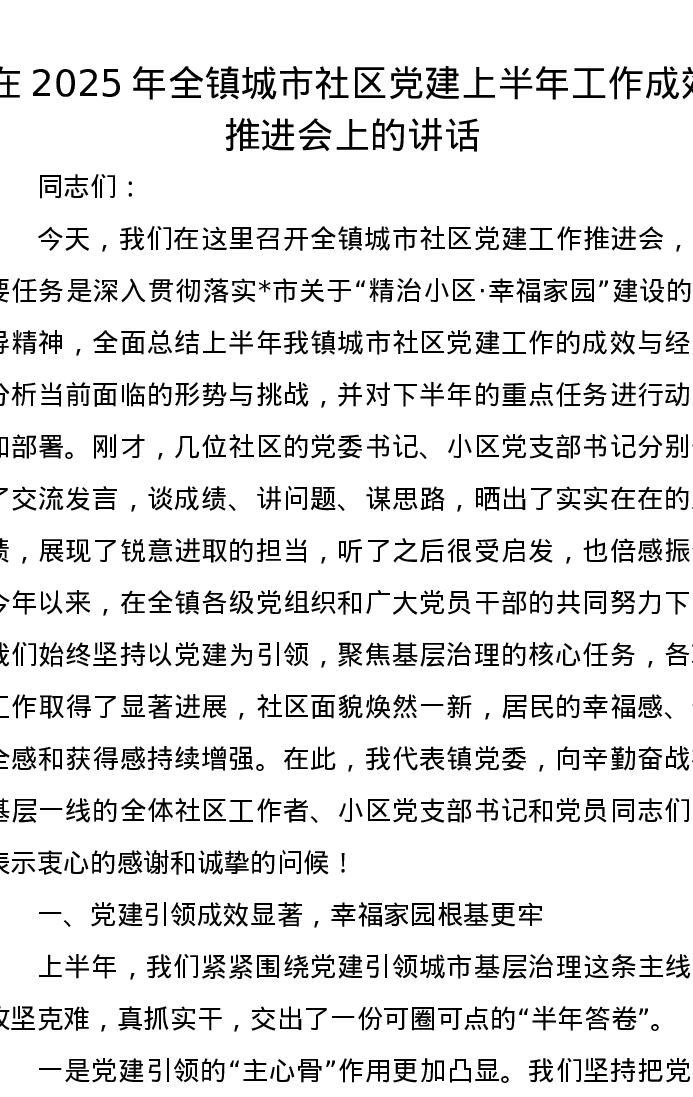 在2025年全镇城市社区党建上半年工作成效推进会上的讲话