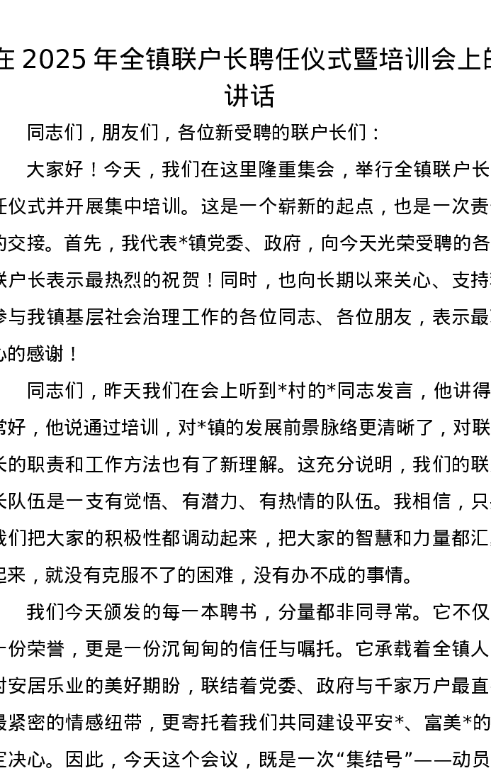 在2025年全镇联户长聘任仪式暨培训会上的讲话