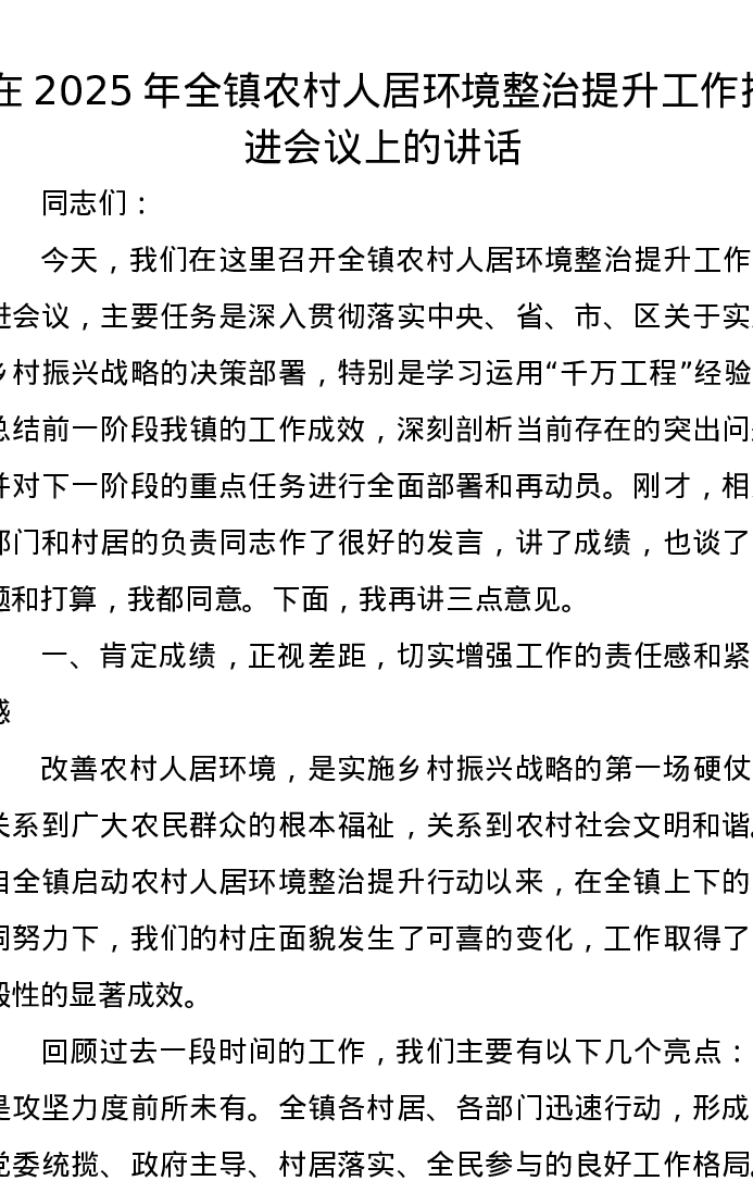 在2025年全镇农村人居环境整治提升工作推进会议上的讲话