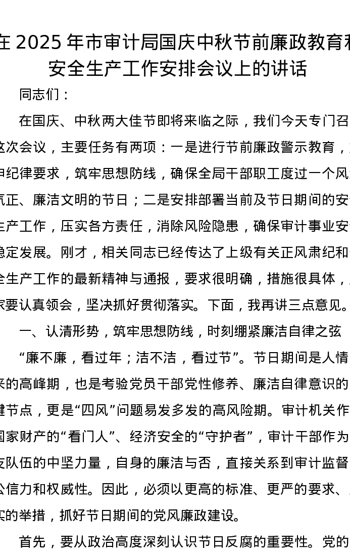 在2025年市审计局国庆中秋节前廉政教育和安全生产工作安排会议上的讲话