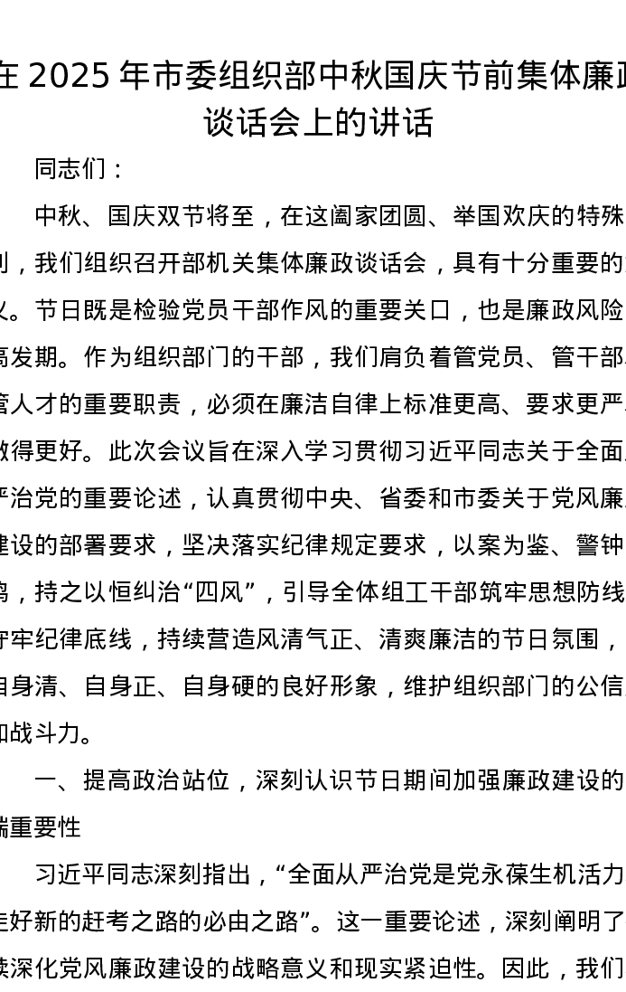 在2025年市委组织部中秋国庆节前集体廉政谈话会上的讲话