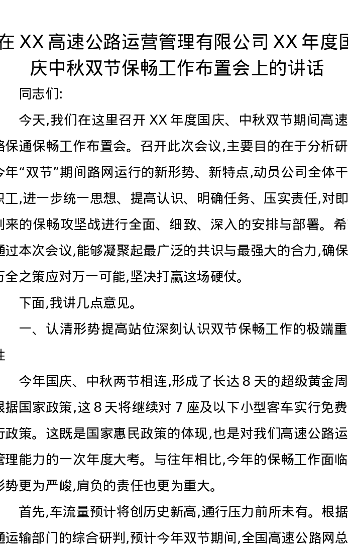 在XX高速公路运营管理有限公司XX年度国庆中秋双节保畅工作布置会上的讲话