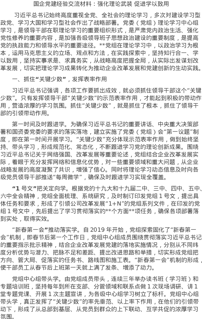 20220711国企党建经验交流材料:强化理论武装 促进学以致用