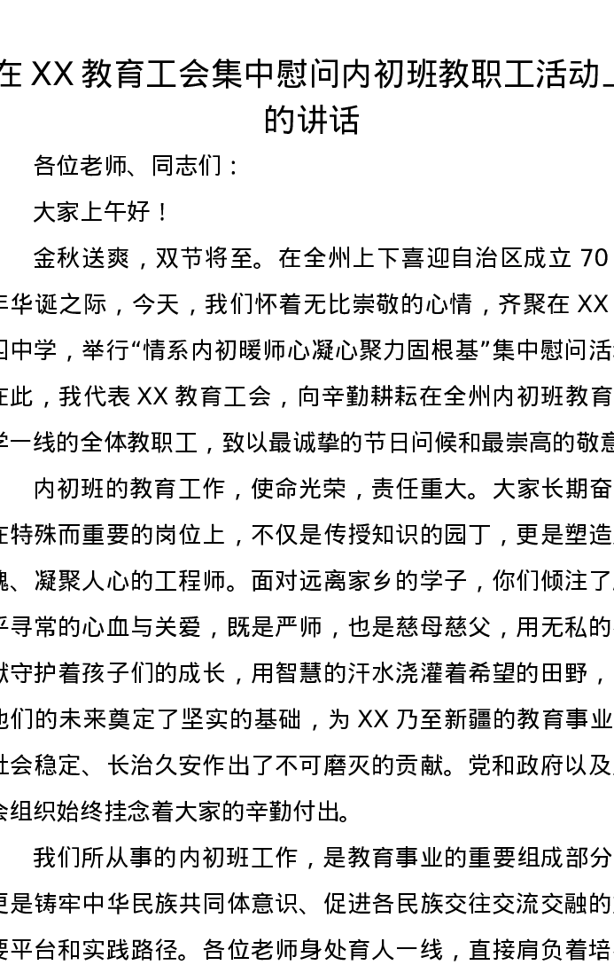 在XX教育工会集中慰问内初班教职工活动上的讲话
