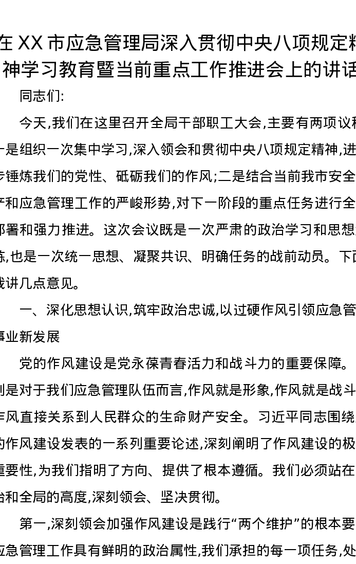 在XX市应急管理局深入贯彻中央八项规定精神学习教育暨当前重点工作推进会上的讲话