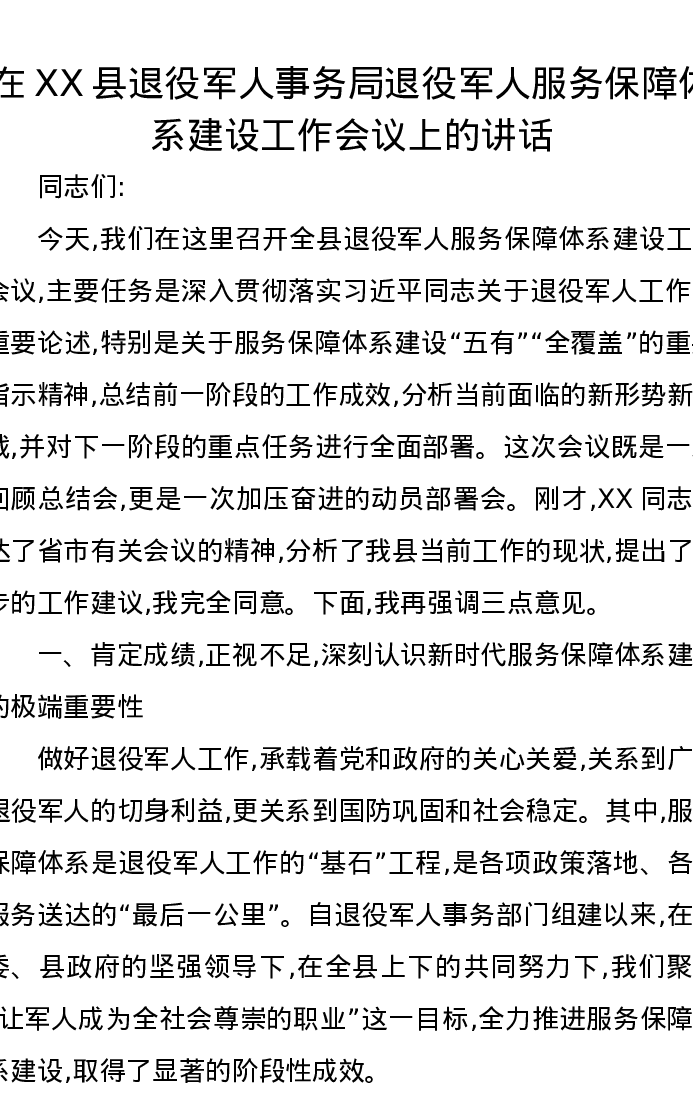 在XX县退役军人事务局退役军人服务保障体系建设工作会议上的讲话
