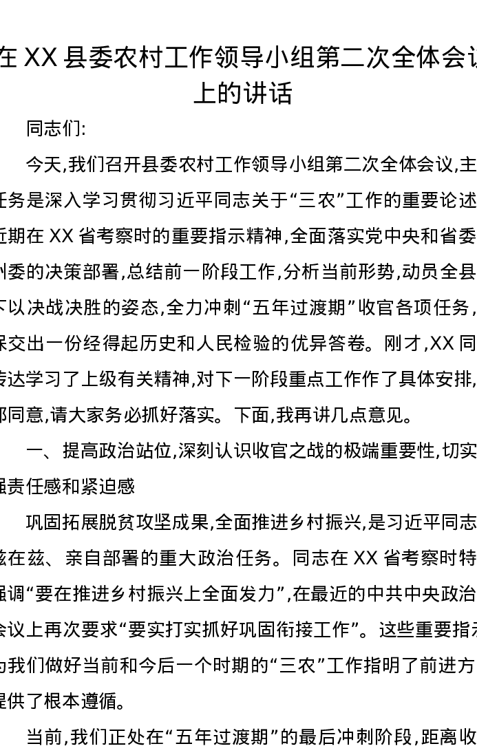 在XX县委农村工作领导小组第二次全体会议上的讲话