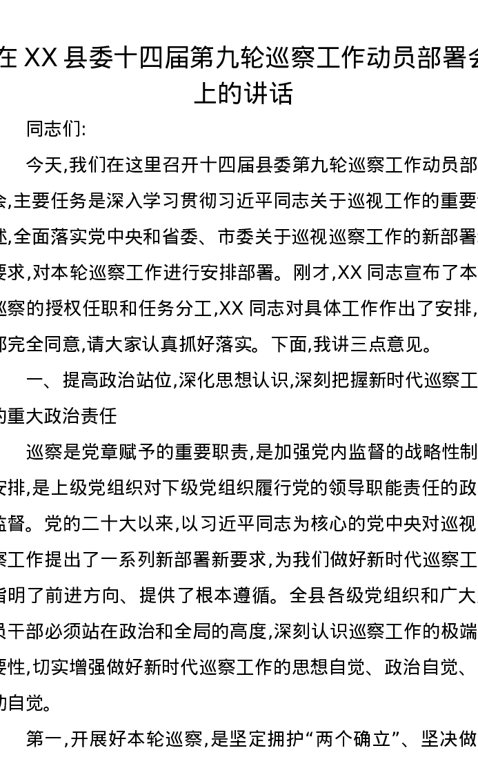在XX县委十四届第九轮巡察工作动员部署会上的讲话