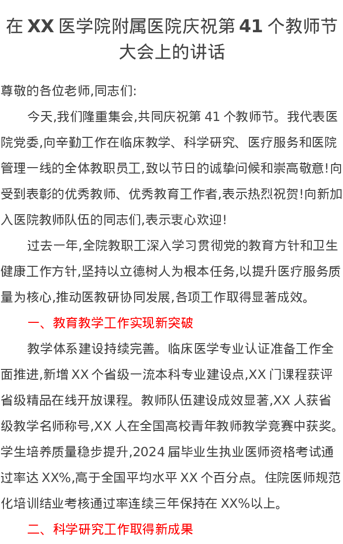 在XX医学院附属医院庆祝第41个教师节大会上的讲话