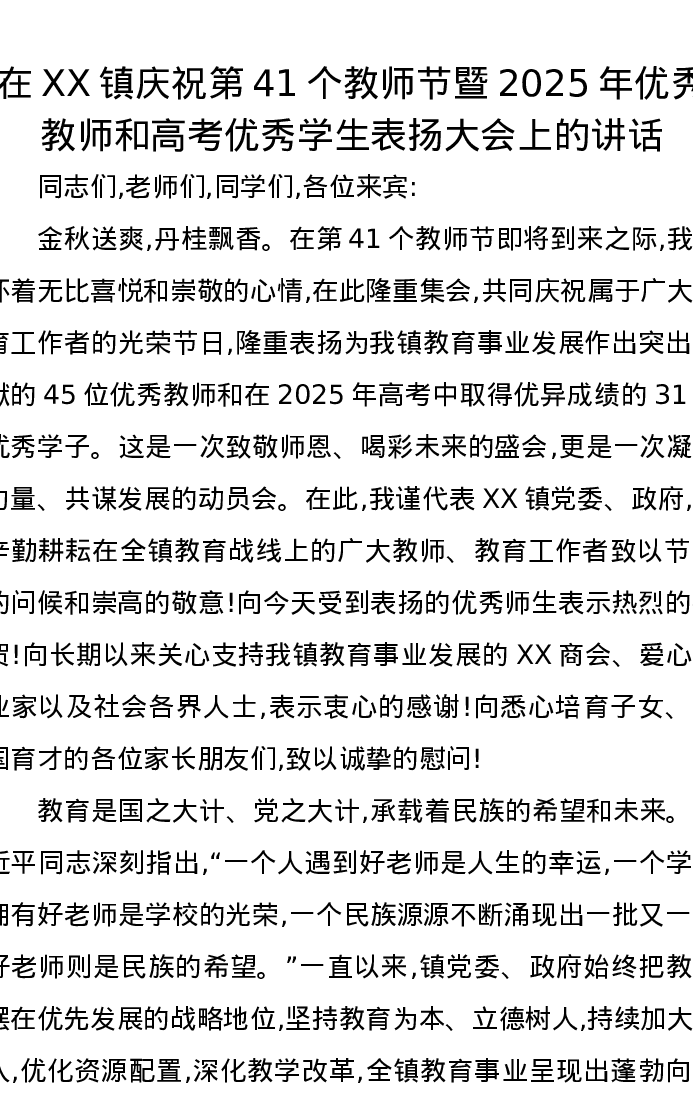 在XX镇庆祝第41个教师节暨2025年优秀教师和高考优秀学生表扬大会上的讲话