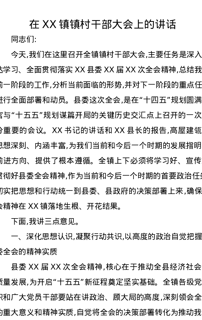 在XX镇镇村干部大会上的讲话