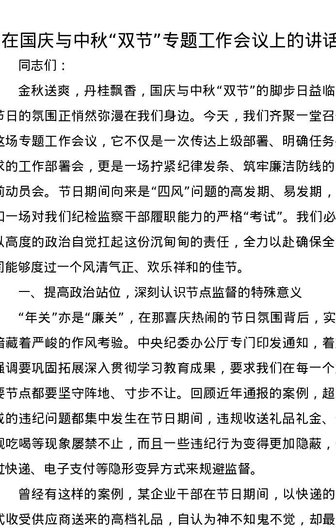 在国庆与中秋“双节”专题工作会议上的讲话