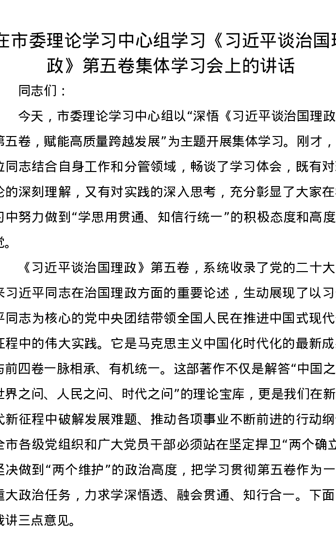 在市委理论学习中心组学习《习近平谈治国理政》第五卷集体学习会上的讲话