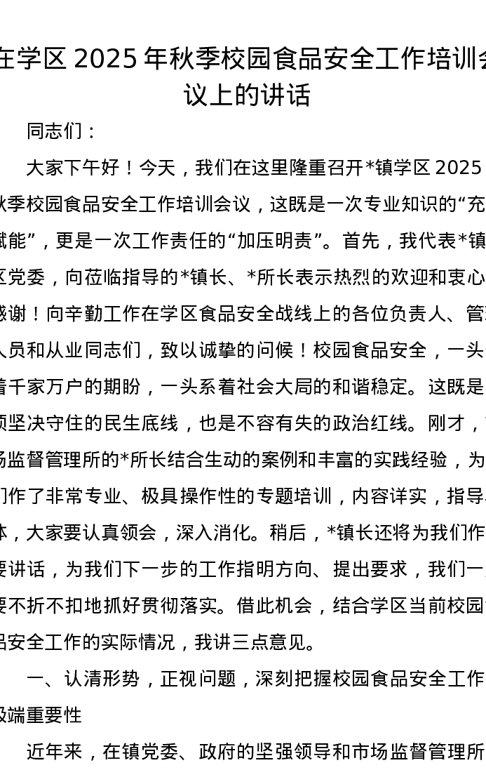 在学区2025年秋季校园食品安全工作培训会议上的讲话