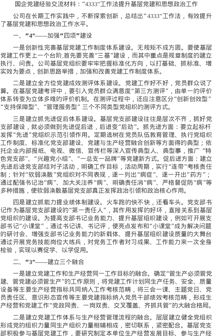 20220712国企党建经验交流材料:“4333”工作法提升基层党建和思想政治工作