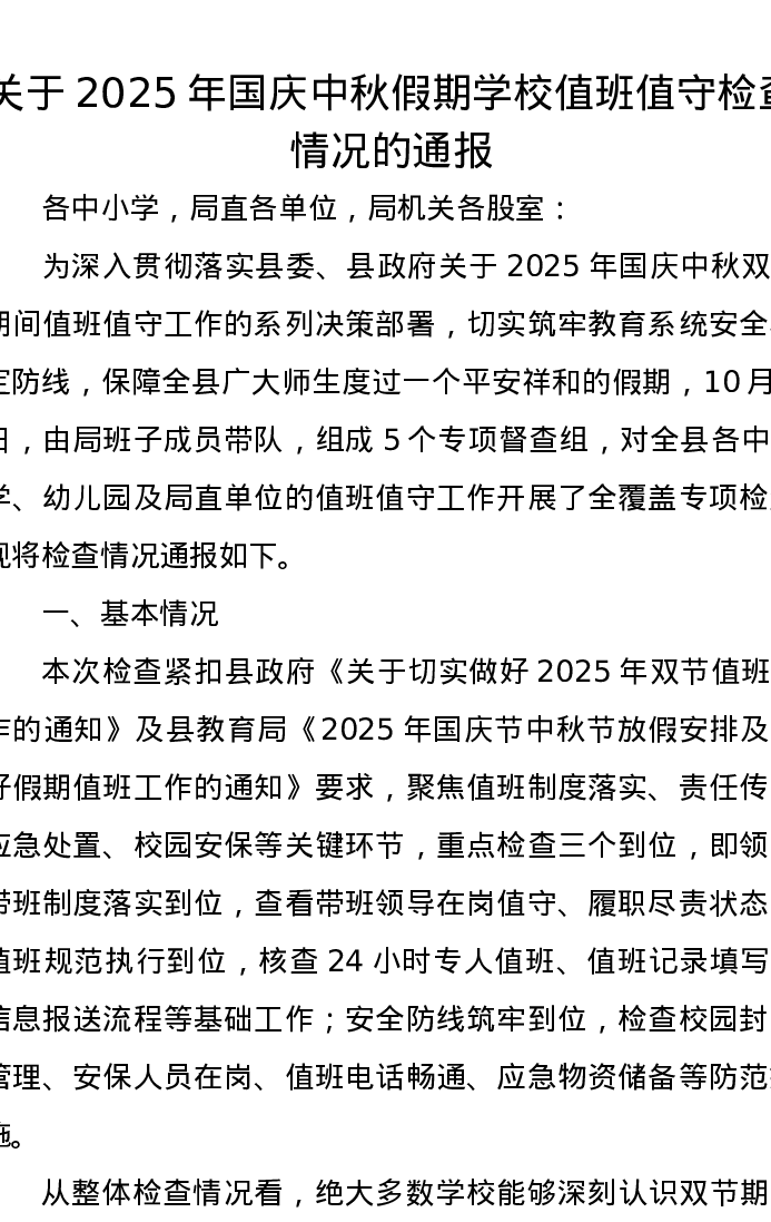 关于2025年国庆中秋假期学校值班值守检查情况的通报