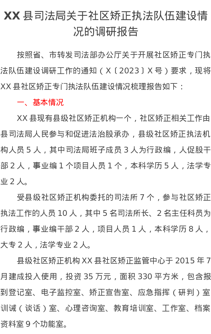 XX县司法局关于社区矫正执法队伍建设情况的调研报告
