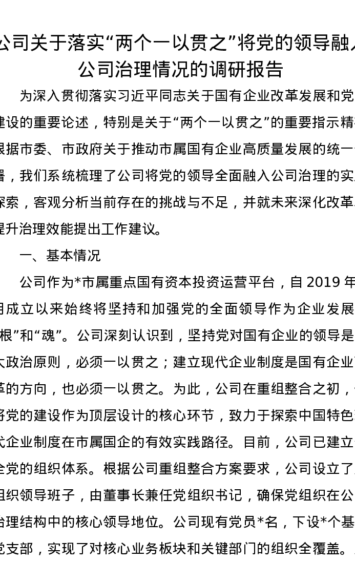 公司关于落实“两个一以贯之”将党的领导融入公司治理情况的调研报告