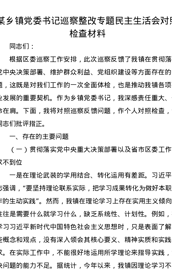 某乡镇党委书记巡察整改专题民主生活会对照检查材料