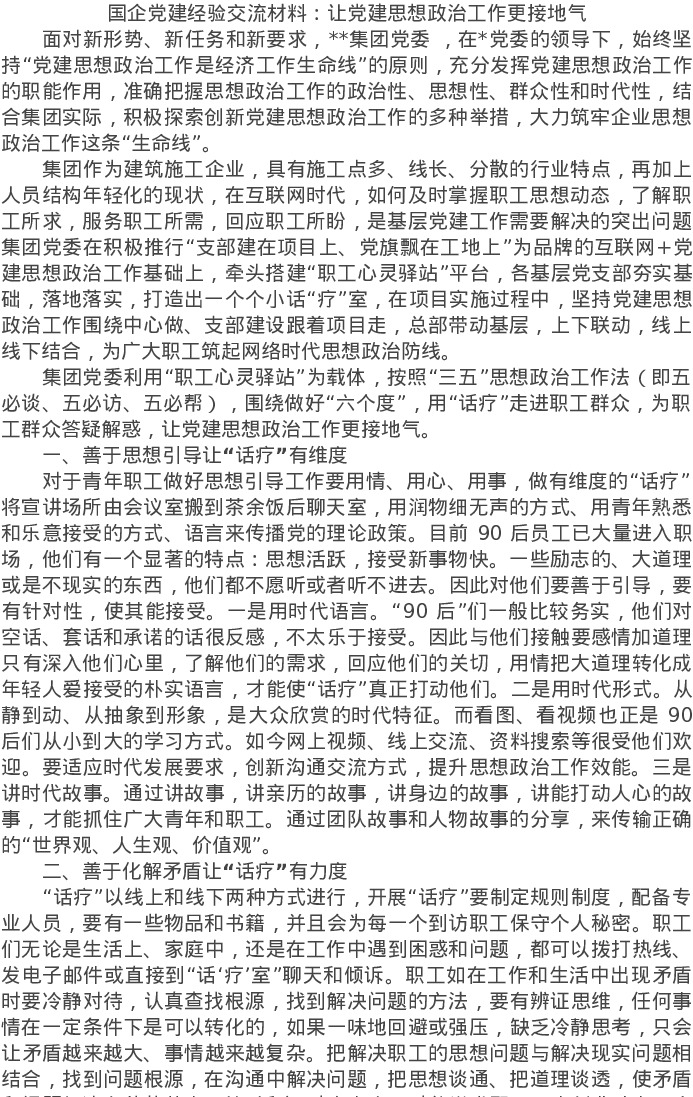 20220712国企党建经验交流材料:让党建思想政治工作更接地气