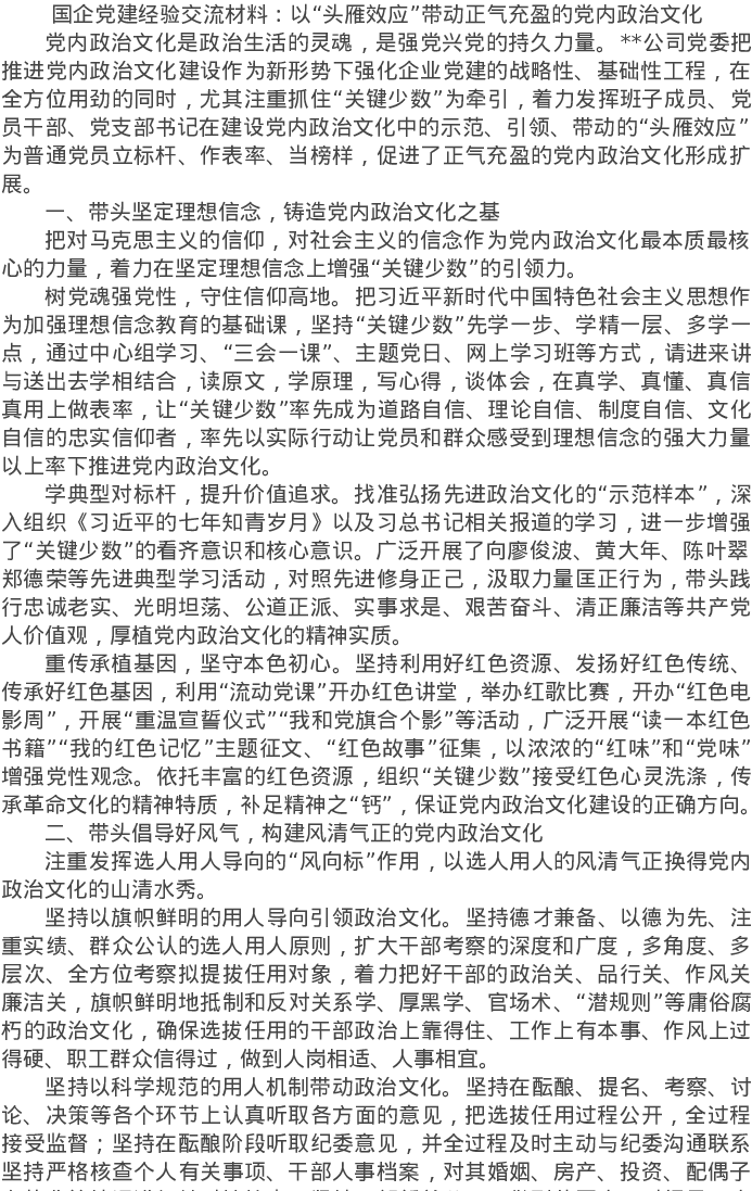 20220715国企党建经验交流材料:以“头雁效应”带动正气充盈的党内政治文化
