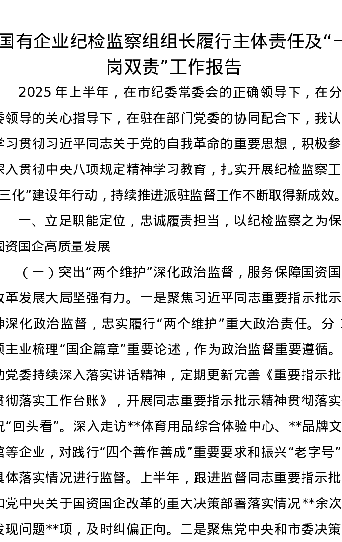 国有企业纪检监察组组长履行主体责任及“一岗双责”工作报告