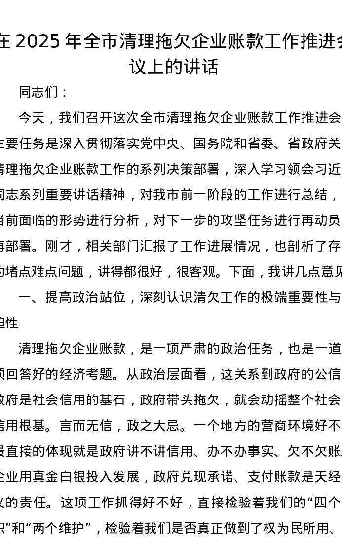 在2025年全市清理拖欠企业账款工作推进会议上的讲话