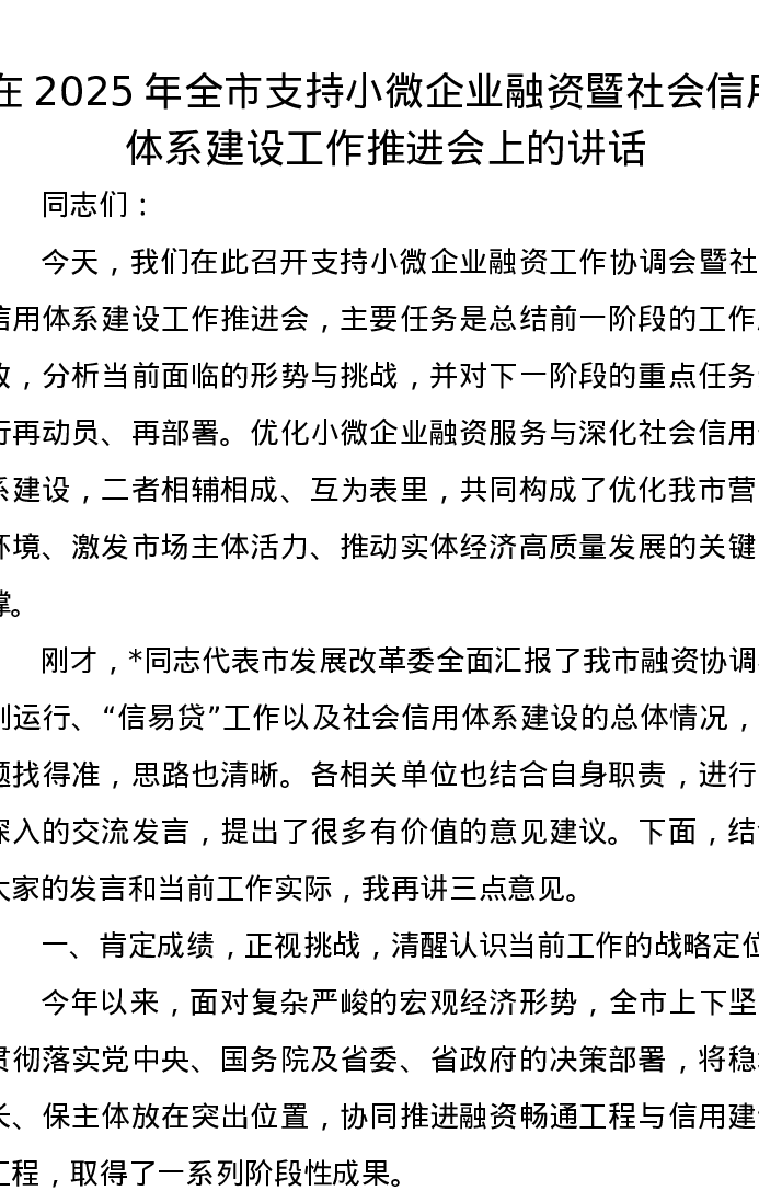 在2025年全市支持小微企业融资暨社会信用体系建设工作推进会上的讲话