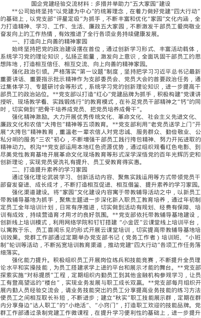 20220715国企党建经验交流材料:多措并举助力“五大家园”建设