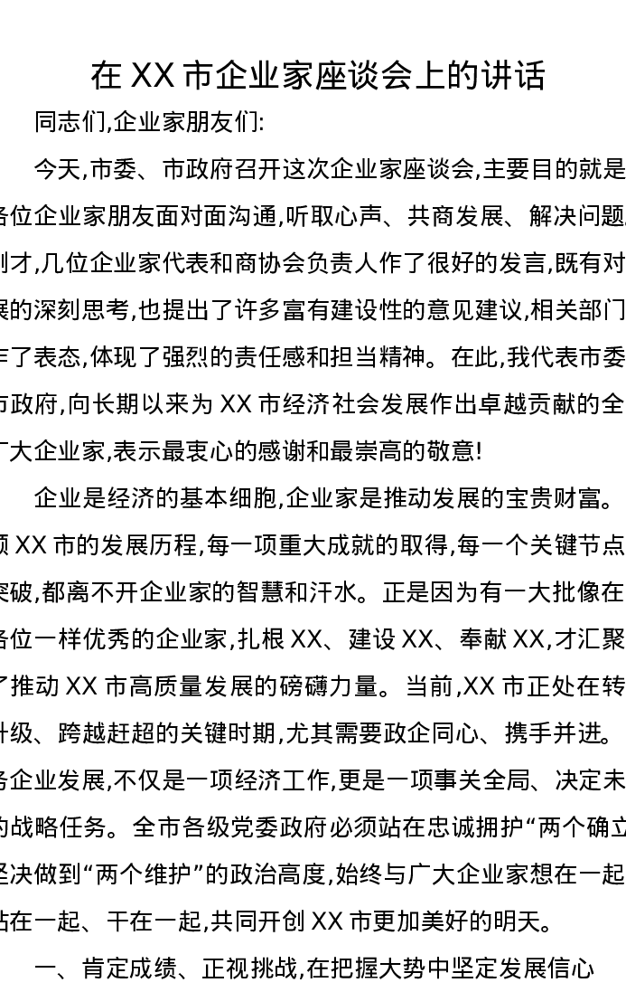 在XX市企业家座谈会上的讲话