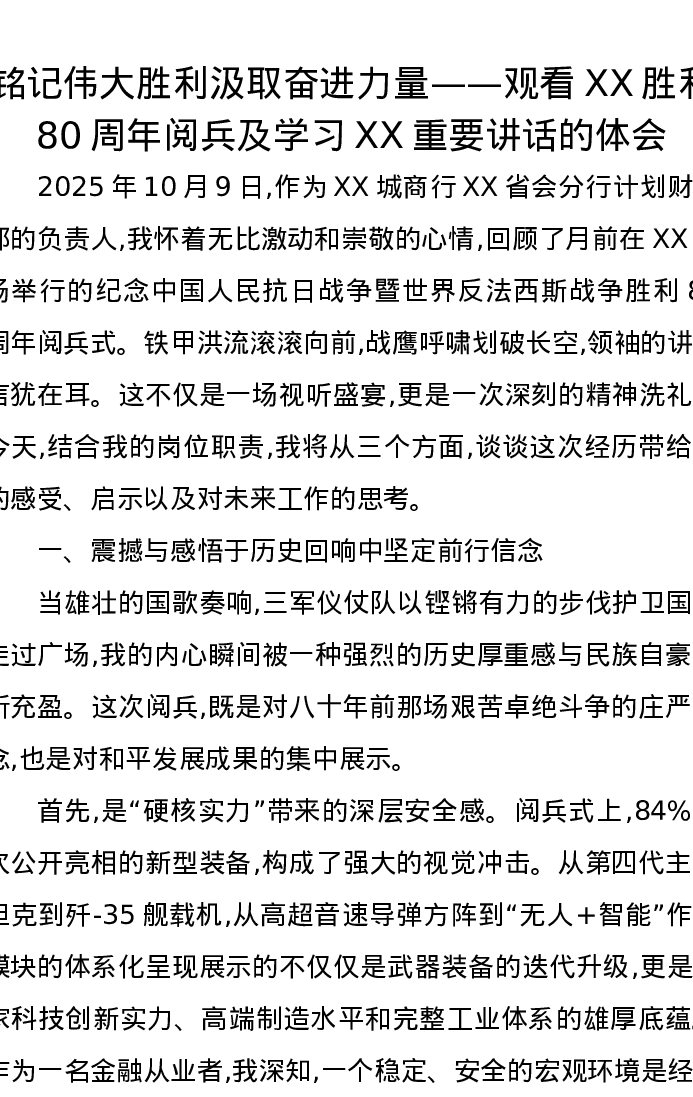 铭记伟大胜利汲取奋进力量——观看XX胜利80周年阅兵及学习XX重要讲话的体会