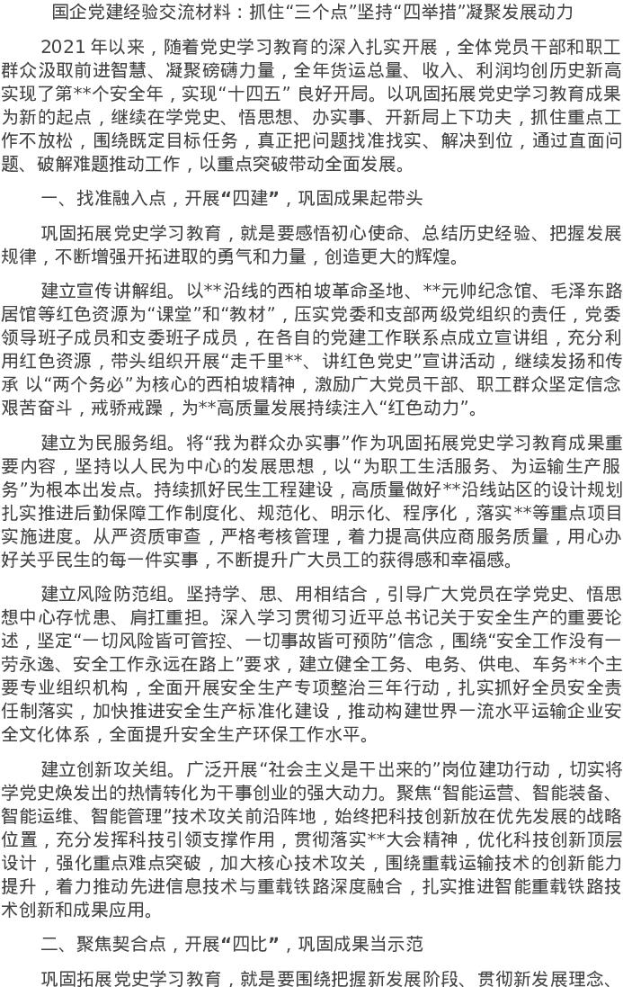 20220715国企党建经验交流材料:抓住“三个点”坚持“四举措”凝聚发展动力
