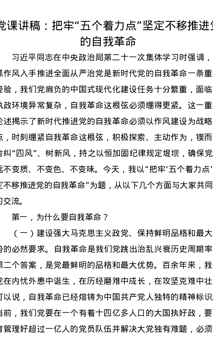 党课讲稿:把牢“五个着力点” 坚定不移推进党的自我革命