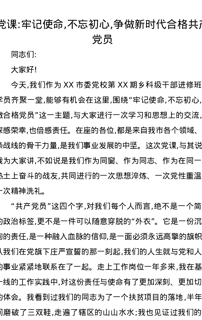 党课讲稿:牢记使命,不忘初心,争做新时代合格共产党员