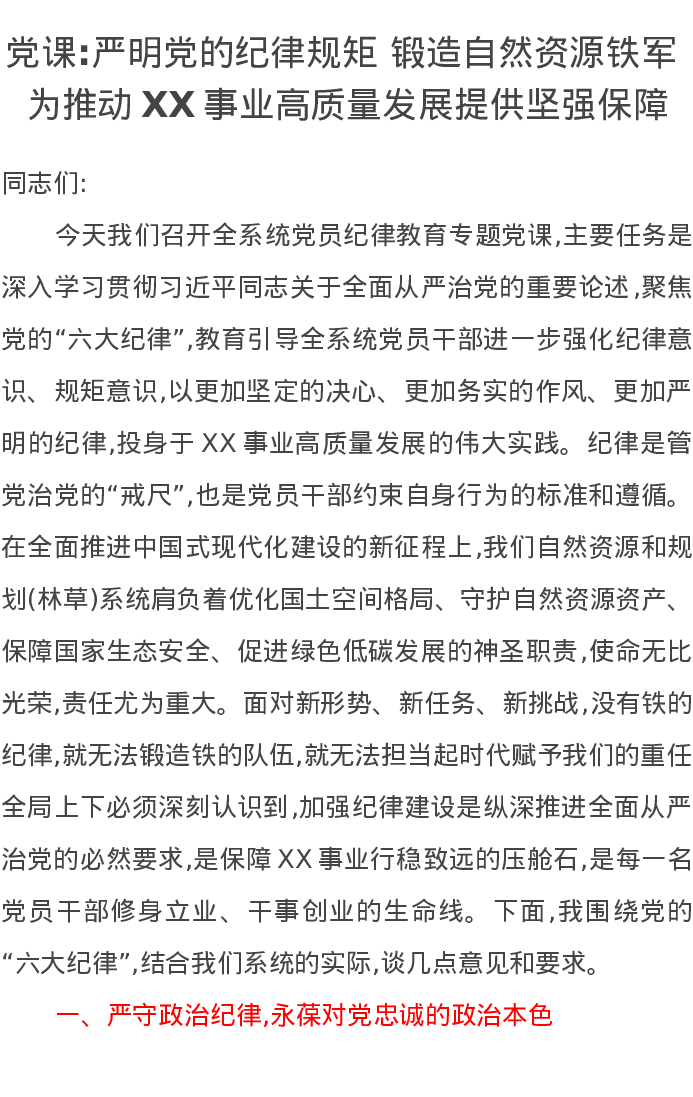 党课讲稿:严明党的纪律规矩 锻造自然资源铁军 为推动XX事业高质量发展提供坚强保障