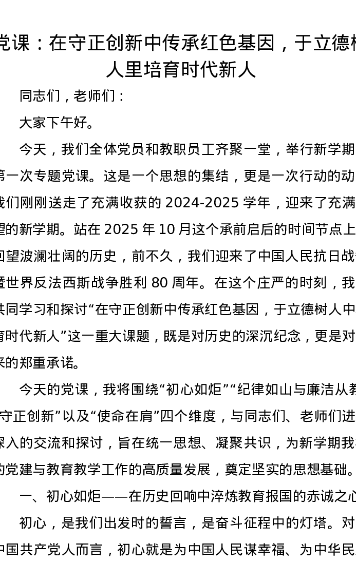党课讲稿:在守正创新中传承红色基因,于立德树人里培育时代新人